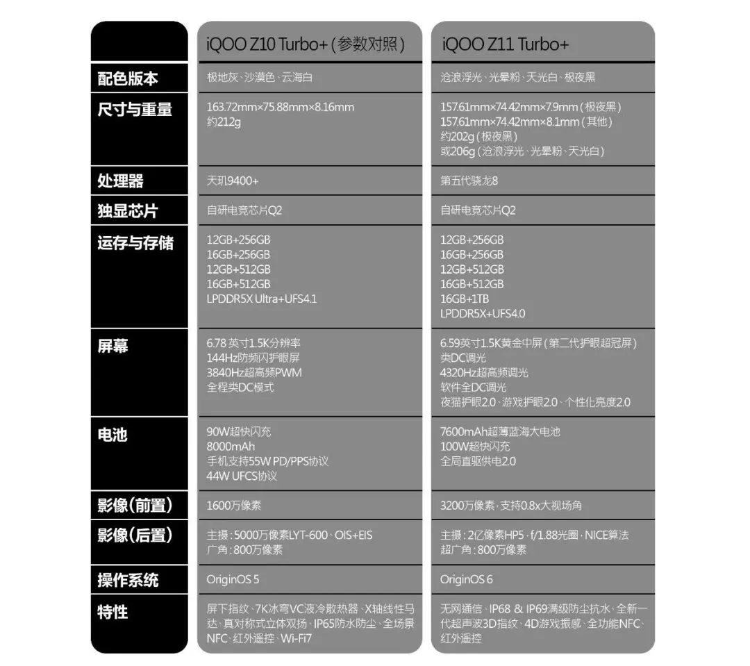 注:作为代系传承的正序表达,我们把Z11 Turbo与半年前的Z10 Turbo+进行指标参照,从天玑9400+到骁龙当季旗舰平台,也让大众看到iQOO这个“性能偏执狂”的诚意。同时,更小的机身尺寸蕴含更大的能量释放,这本身就是一件能够抓住人心的事,这也让Z11 Turbo的7600mAh超薄蓝海大电池在Z10 Turbo+的8000mAh电池面前并不显得“害羞”。况且,在闪存价格暴涨的情况下,Z11 Turbo居然还保留了1TB ROM的选择,相对前面两代作品,此举绝对出人意料。