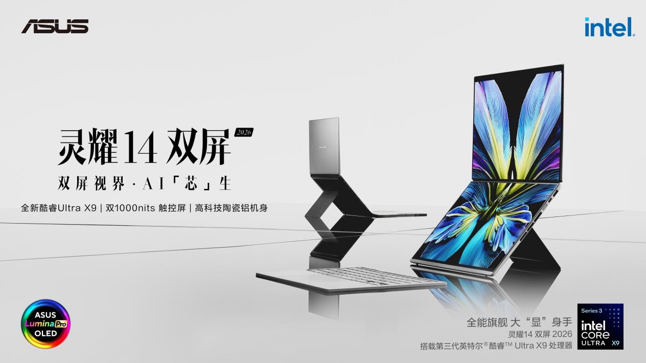 AI时代的移动生产力工具,该如何实现进阶?答案不仅在于AI算力的升级,也在于交互体验的不断革新。全新华硕灵耀14 双屏 2026搭载第三代英特尔酷睿Ultra X9处理器,实现性能与AI算力双重跃升,重新定义移动办公创作的效率新高度,加上一机双屏创新设计打破形态边界,以无界视野适配多元场景,为你带来高品质生活享受。