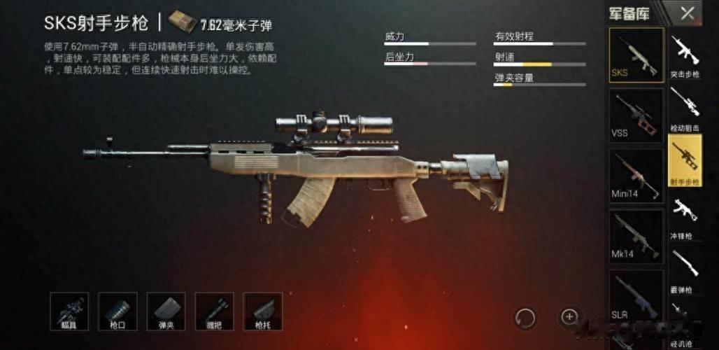 - 游戏圈封神之路:在《和平精英》《绝地求生》中,SKS被设定为7.62mm口径射手步枪,基础伤害57点,初始弹容量10发(可扩容至20发);虽垂直后坐力较大,但满配(枪口补偿器+轻型握把+托腮板)后稳定性显著提升,250米内可实现精准连射,成为中距离对抗的“满配神器”;游戏中的高伤害、高配件扩展性设定,还原了其现实中的精度优势,让年轻玩家通过虚拟战场认识这款经典步枪。