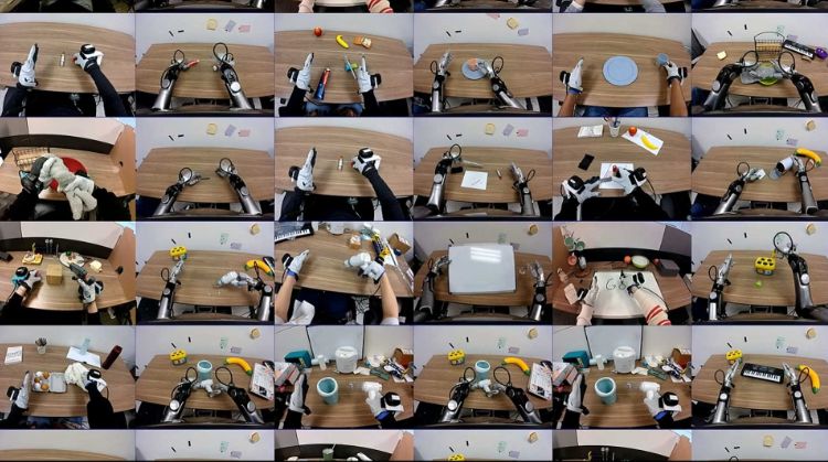 在人类和遥操作机器人使用相同的摄像机设置执行相同的344个桌面任务的情况下,研究人员收集了小数量、仔细对齐的数据集。在此过程中,操作人员穿着MANUS手套捕捉每只手的25个关节变换高保真手指数据,Vive追踪器被用于记录手腕运动。相同的运动捕捉设置用于机器人远程操作,确保人和机器人的动作信号是直接可比较的。
