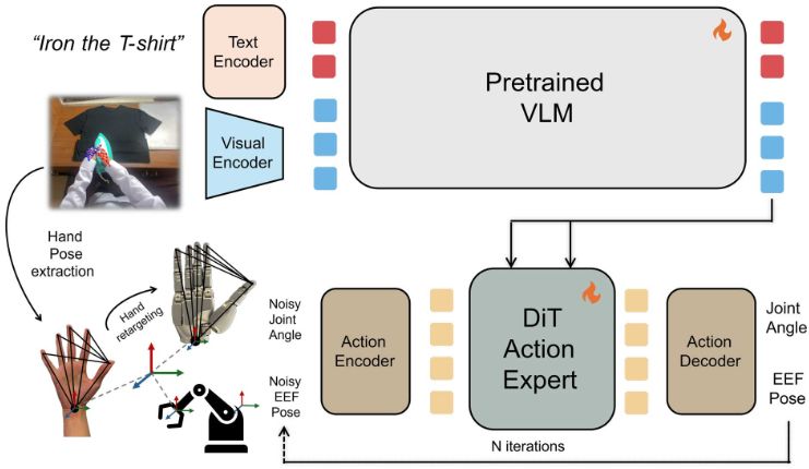 基于流的VLA策略架构,具有VLM主干和DiT动作专家,使用腕级动作表示和轻量级体现适配器来统一人类和机器人数据。