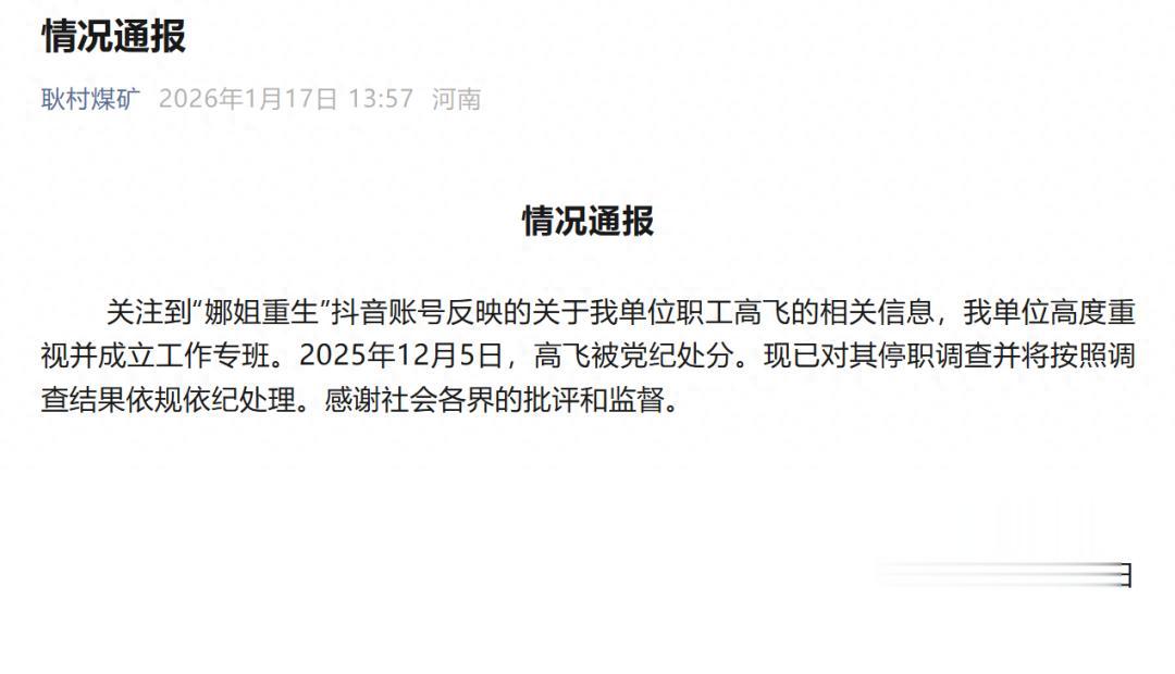 关注到“娜姐重生”抖音账号反映的关于我单位职工高飞的相关信息,我单位高度重视并成立工作专班。2025年12月5日,高飞被党纪处分。现已对其停职调查并将按照调查结果依规依纪处理。感谢社会各界的批评和监督。