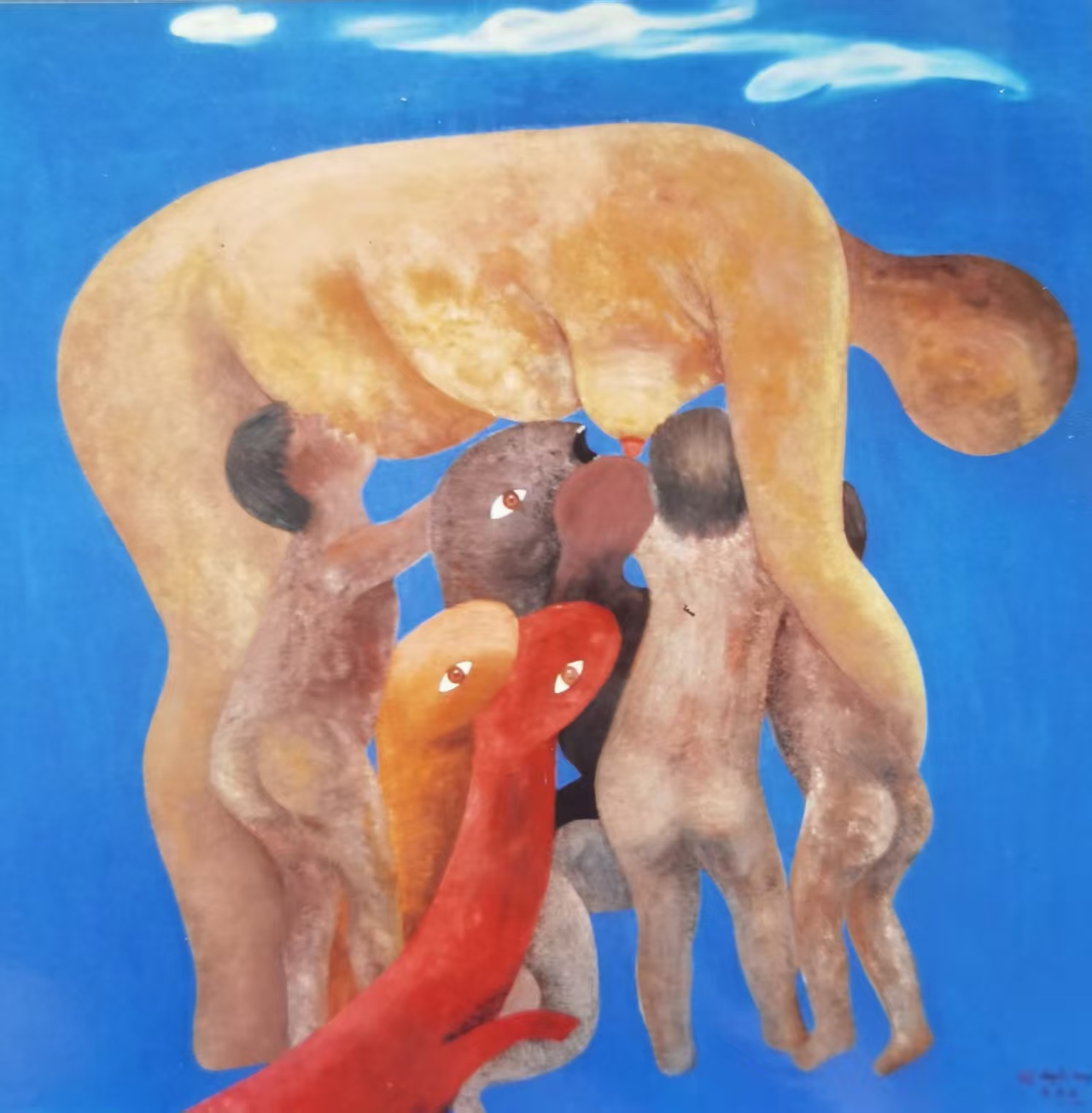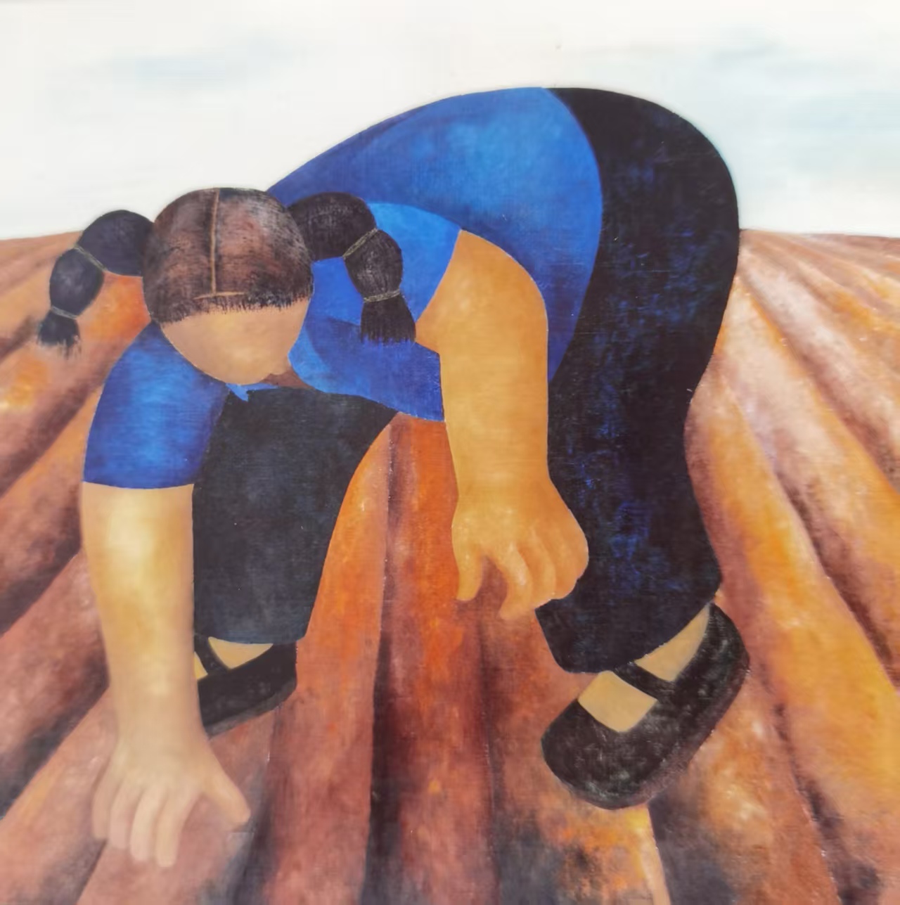 黄承林先生之艺,盖以雕塑之骨,融油画之肤,成“乡土之塑”。其象非绘于缣素,实捏于泥坯:《耕耘》里农妇弓起的脊背,以厚涂的赭色堆出雕塑般的弧度,每一处颜料的堆叠都是泥土的肌理;《负重》中汉子的肩膀,简化成几何化的块面,却藏着“扛住生活”的张力。他笔下的人物,四肢被拉长、躯干被压缩,像被土地“捏塑”出的原型——没有精致的五官,只有生存的姿态:躬身是春耕,负子是牵挂,《哺乳》之母体,舒展如坤舆之孕——“形简而意丰,体朴而神厚”,此非一人之貌,乃壤中所生之灵,载土脉之温,负田畴之重。