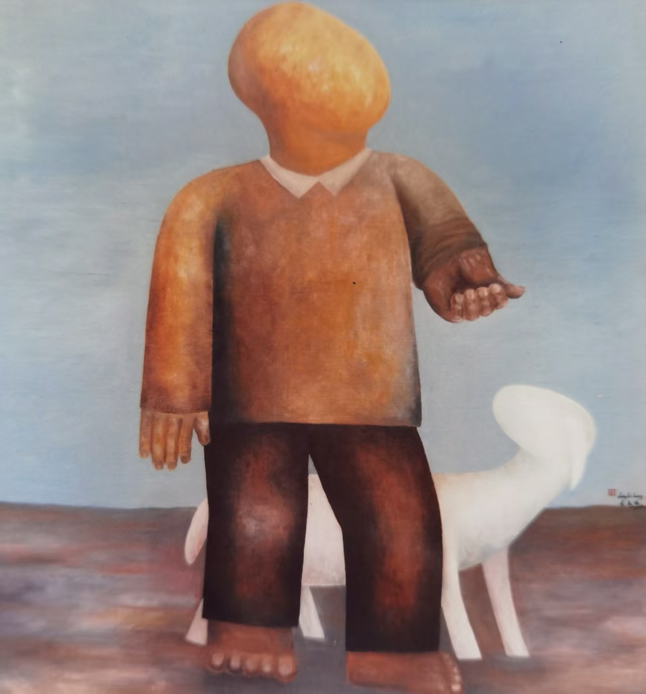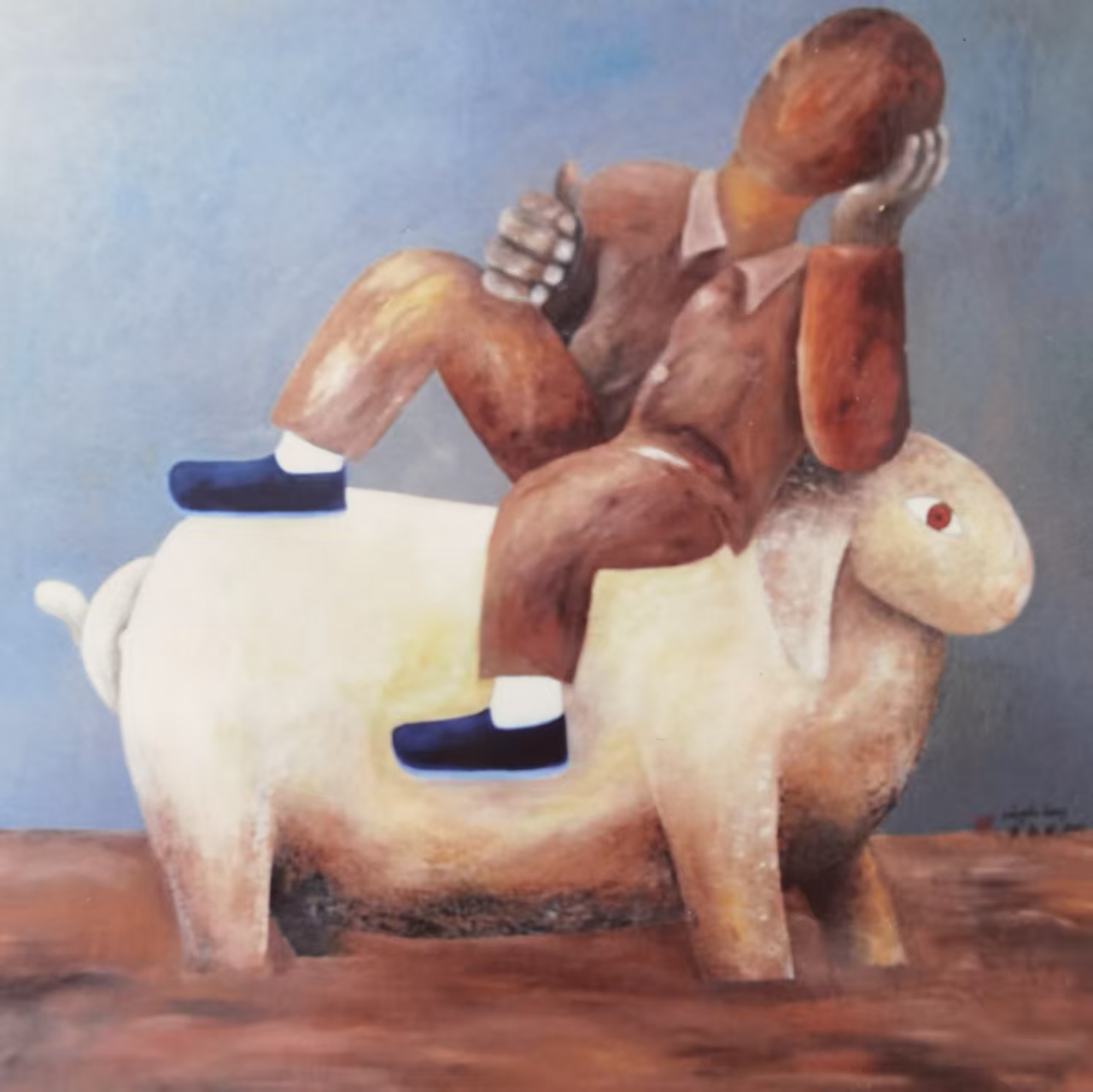黄承林先生以“褐”为土地的底色,又以“蓝”为灵魂开了一道缝。那些棕褐与赭红的色块,裹着农人的裤脚、粘在农具的木柄上,是生存的沉重;而《呐喊》里明蓝的背景、《奔逃》中浅青的地平线,则是精神的逃逸——嘶吼的人像脱离了泥沼,奔跑的躯体挣脱了重力,连骑在羊背上的人低头掩面的姿态,都成了生存重压下的“片刻失神”。此蓝非天之景,乃魂之息也:躯体重则重矣,精神得借青冥而飘举,是为乡土灵府之偶一舒怀。