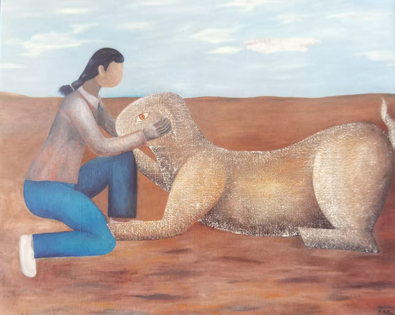 作为雕塑家与油画家,黄承林从未让两种媒介割裂,实“以媒介转乡土之魂”。塑者,凝壤之质,立其骨;绘者,染生之气,敷其肤。是以其象脱“旧乡之怀”,成“今时之图腾”:既载泥壤之粗粝,复具向新之弹性;既是乡土之根,亦能于当代艺境中,唤起人土相连之精神联结。黄承林先生的作品,是写给泥土的诗,也是写给灵魂的碑:那些被捏塑的身影,既是土地的孩子,也是时代的行者,在块面与色彩的交织里,完成了乡土精神的当代转译。