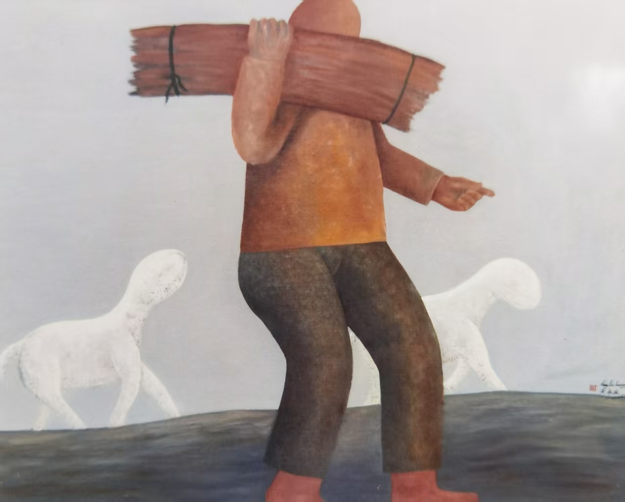 其画作刻意去人面之详,存躯体之态,“消个体以成群像,略悲欢而显本真”。《负子》之妪颈曲如辕,《荷薪》之夫肩挺如樯——此皆乡土之“常姿”,无关一己之哀乐,实为代际相承之生存本能。其“无面”之法,解个体之戚,凝群生之韧:诸影非某农某妇,乃“乡土苍生”之群像,默立于缣素之上,成一部沉雄之生存史诗,每道轮廓皆载世代相续之生命力。