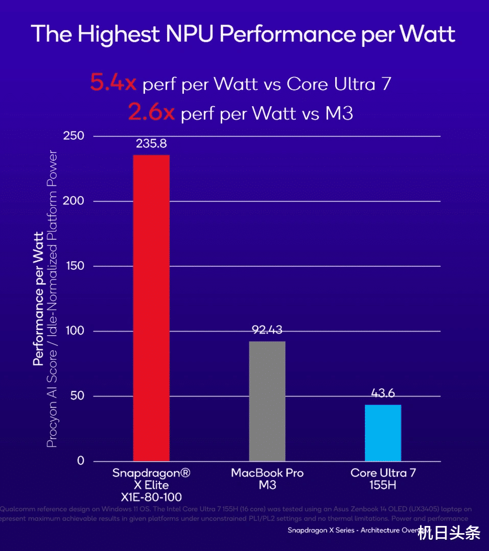 作为今年的明星平台,高通骁龙X Elite采用先进的4nm工艺,专为AI应用场景量身打造。与苹果M系列芯片相比,骁龙X Elite在传统运算能力上实现了显著提升,其12个4nm大核心的设计让多任务处理和高强度工作负载变得游刃有余。