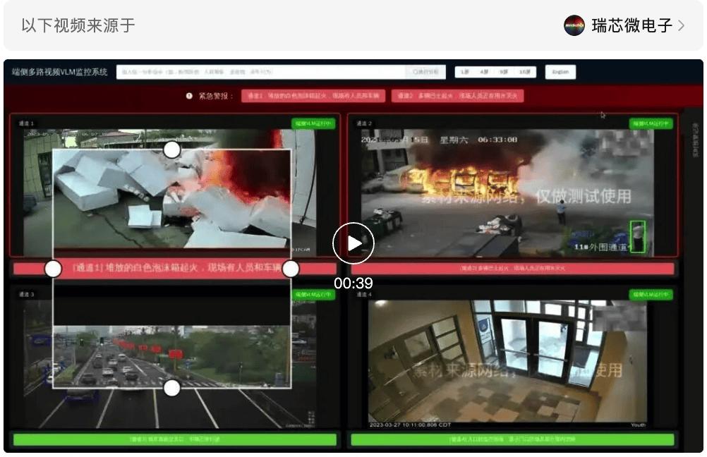 从“看清”到“看懂”,处理复杂模型的“直觉”与“认知”。新一代硬件需要充分理解用户指令并具备对“长尾场景”的认知能力。如传统的监控设备,能准确识别人、车、物等目标,RK182X的强大端侧AI算力,能够让新一代AI设备具备解读事件和行为的能力,实现同时分析四路视频实时预警功能,异常响应仅需 0.5 秒,每路均能输出视频理解后的场景和行为细节描述。