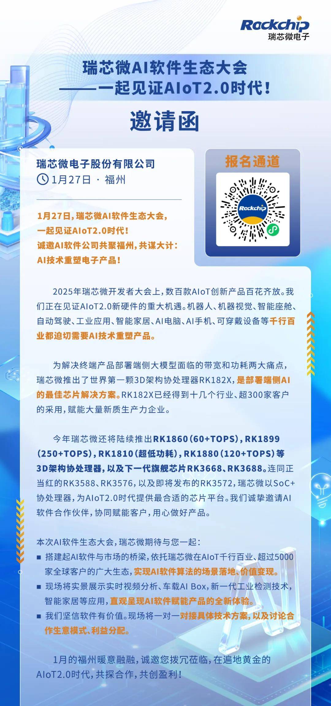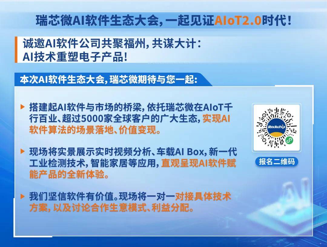 瑞芯微首届AI软件生态大会,诚邀AI软件公司共聚福州,共同探讨端侧AI在机器人、机器视觉、智能座舱、自动驾驶、 工业应用、智能家居、AI电脑、AI手机、可穿戴设备等千行百业的落地路径与商业模式。共同搭建起AI软件与市场的桥梁,依托瑞芯微在AIoT千行百业、超过5000家全球客户的广大生态,实现AI软件算法的场景落地、价值变现。