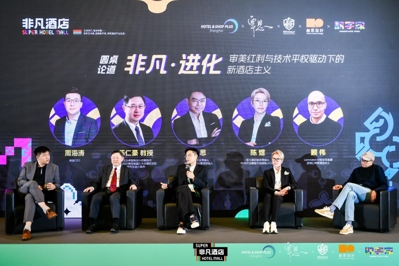 而在由闻旅CEO周海涛主持,亚太远卓首席设计战略顾问、2023-2025新加坡国立大学建筑学院研究生设计导师苏仁豪,Labbrand朗标管理合伙人顾伟,创思国际设计集团创始人覃思,WHA平台创始人CEO 陈煜参与的“非凡·进化: 审美红利与技术平权驱动下的新酒店主义”主题论坛环节,就审美红利如何对冲硬件折旧、中小单体酒店如何享受技术平权、如何解决设计建造方案及供应链痛点等话题进行了观点分享。