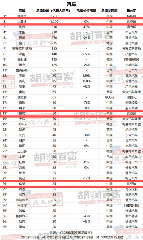 汽车行业的“榜单大战”刚被按下去,现在一个“新的”榜单又来了。这次发布榜单的,不是某个部门,也不是某家车企,更不是某家媒体,而是一个我们很熟悉的名字——胡润。2025胡润汽车品牌榜出炉。在榜单上,品牌价值突破千亿人民币的只有两家车企,分别是特斯拉和比亚迪。其他的品牌,跟特斯拉和比亚迪都不是一个量级的存在。