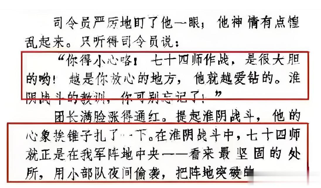 因为在苏北一带的淮阴战斗中,七十四师就正是在我军阵地中间看来最坚固的结合处,用小部队夜间偷袭把阵地突破的,这种“出其不意,攻其不备”的战术在苏北一带,最开始确实给华中野战军造成了一些麻烦。