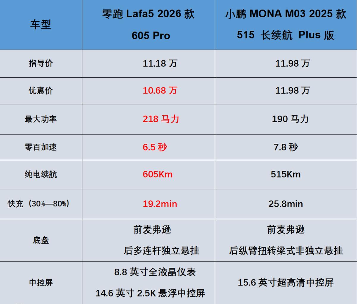而小鹏MONA M03 2025款 515 长续航 Plus版的指导价为11.98万,目前并没有优惠可言,这个版本的电池容量为51.8KWh,纯电续航里程为515Km,快充时间为25.8分钟,不得不说零跑Lafa5这款车在价格占优的局面下,续航、补能效率还是有不错的优势。