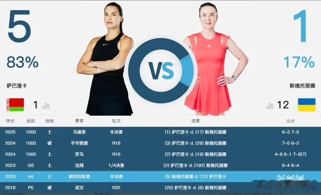 萨巴伦卡职业生涯与斯维托丽娜交锋6次拿下了5胜1负,其中近三年的四场比赛都是萨巴伦卡笑到最后,今日第一盘比赛,两人第一个发球局各自保发,随后萨巴伦卡一保一破以3-1领先,在2-5非保不可德的发球局,斯维托丽娜再次被破发,萨巴伦卡以6-2先赢一盘。