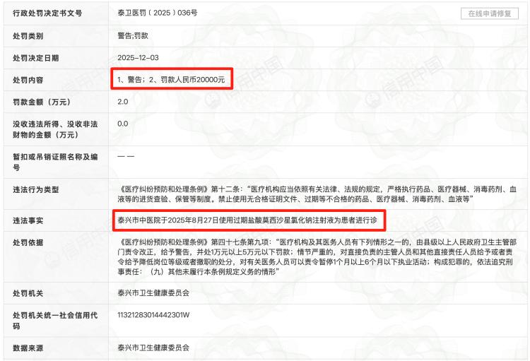 泰州市政府网站“信用泰州”的官方消息显示,12月3日,针对王女士的投诉,泰兴市卫生健康委员会公布了处罚决定,确认泰兴市中医院于2025年8月27日使用过期盐酸莫西沙星氯化钠注射液为患者进行诊治的违法事实。依据《医疗纠纷预防和处理条例》相关规定,泰兴市卫生健康委员会对泰兴市中医院作出了罚款2万元及警告的处罚。