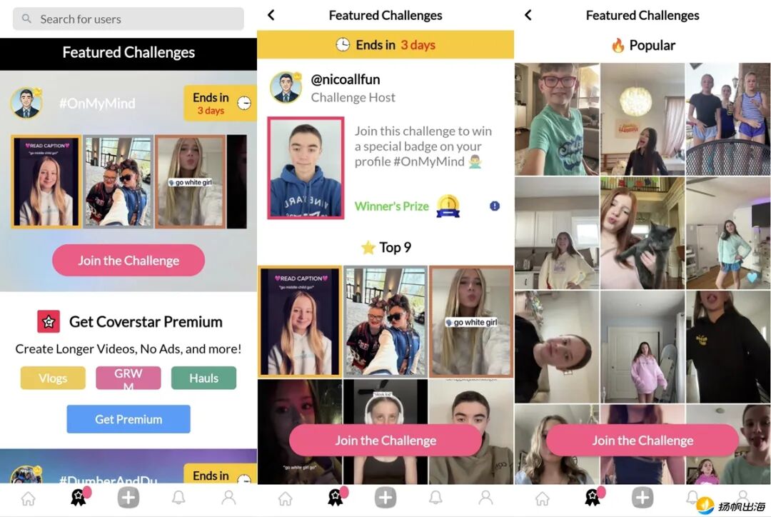 同样是“争夺注意力”,Coverstar还选择了另外一条路径:引导用户进行内容创作。应用专门开辟了一个板块,蕴含着各式各样的“挑战”任务,用户加入挑战便有机会赢取特殊徽章以展示在主页。