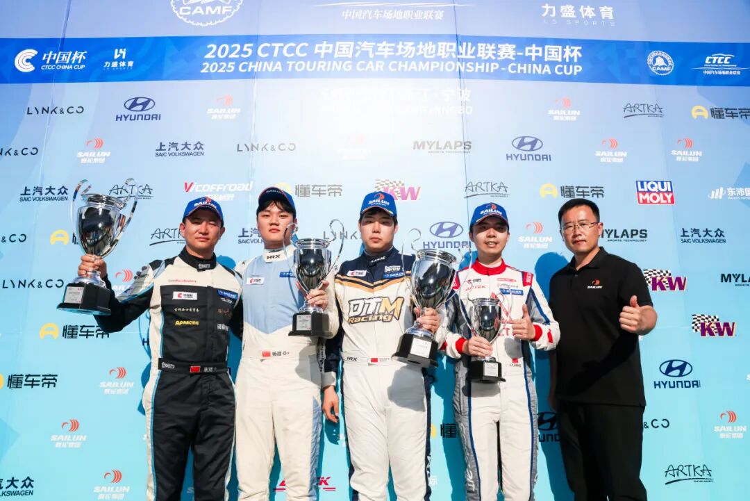 转战浙江宁波,车队迎来了赛季高光时刻。第一回合正赛,王颢森以杆位制胜之姿捧得组别冠军,63号车组谢旸/杨澄紧随其后,北京DTM Racing包揽组别冠亚军。第二回合正赛,王颢森愈战愈勇,领先第二名5秒率先过线,再夺胜利。绍兴柯桥站的复杂天气考验中,车队顶住暴雨与高温的双重压力,63号谢旸/杨澄与53号王颢森/王俊尧分获首回合组别亚、季军。63号车组次回合再度登台,以稳定发挥巩固积分优势。