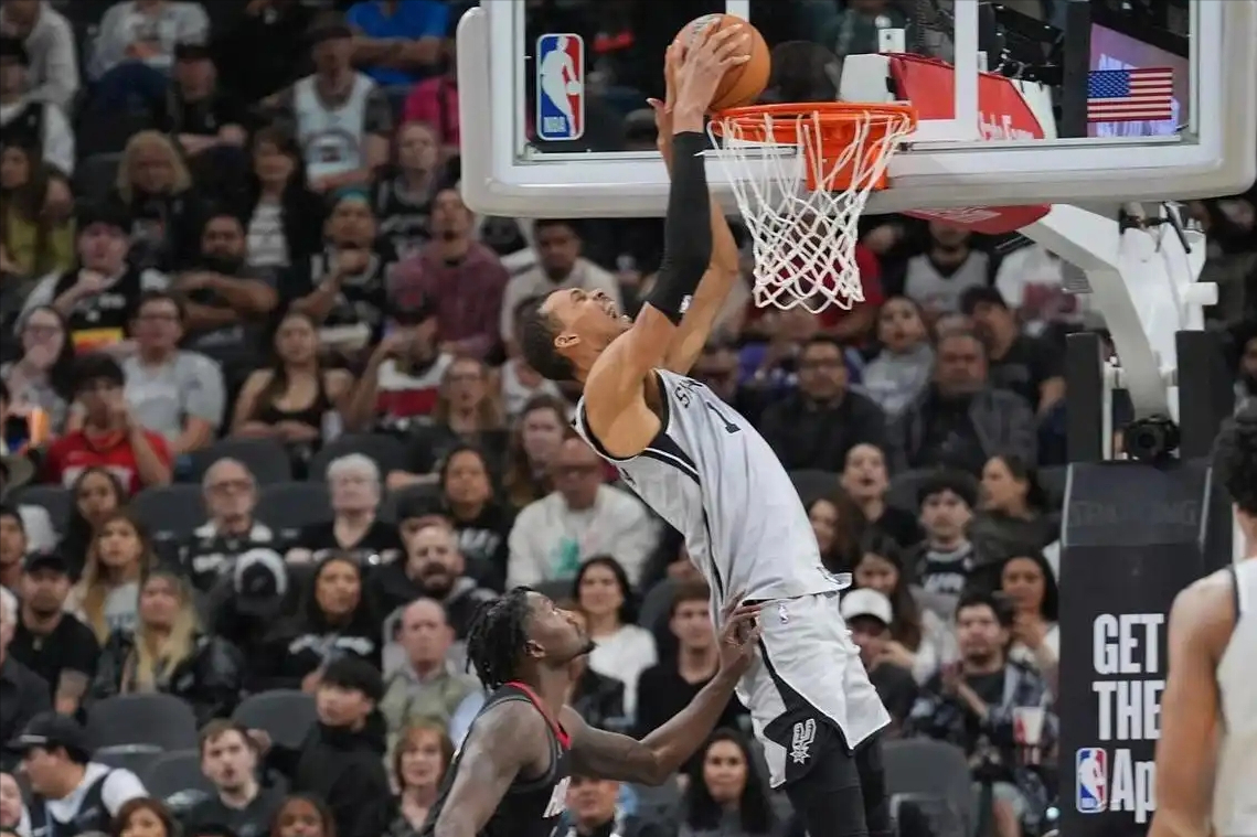 休息归来,文班亚马的扣篮秀进入高潮,马刺也彻底接管比赛。他们在半节时间内再度打出24-10的恐怖攻势,将分差直接扩大到20分以上,文班亚马在此期间连续上演三记精彩扣篮,其中一记空中接力反扣更是被现场解说称为“年度十佳级别”,他在空中的滞空能力和身体协调性,完全突破了长人球员的物理局限。