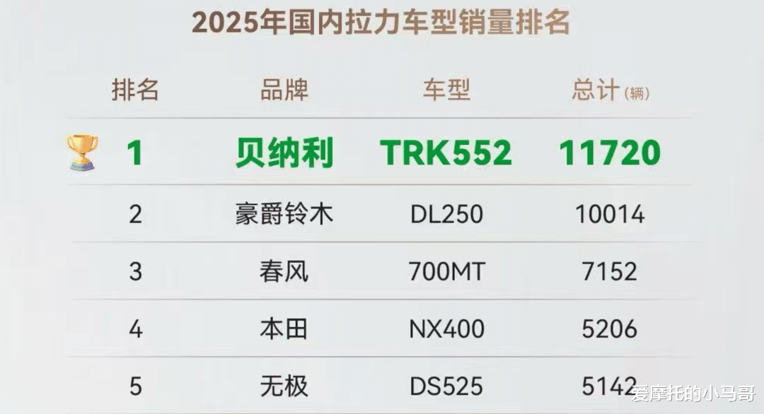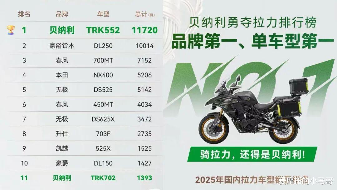 猜猜2025年度最畅销的拉力车型是哪款?答案其实还挺让人感到意外的,因为答案往往会是那种受众更加广泛的小排量入门车型,比如素有“小马拉大车”之称的豪爵DL250/DL150,然而实际结果却是中大排量阵营的贝纳利 TRK552 以断层优势登顶单一品类销冠,同门 TRK702 亦强势跻身榜单前列,助力贝纳利轻松斩获拉力品牌销量第一。