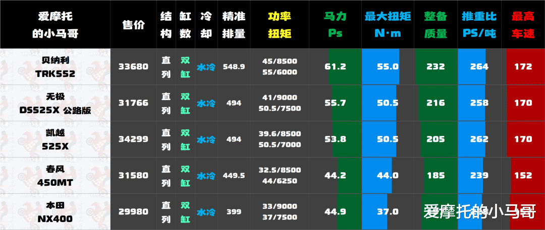 拉力车的核心竞争力,终究要回归动力表现。不过上面的榜单毕竟是销量榜,所以排量有点过于“参差不齐”了,放到一起比不太合适,所以咱就单独把500cc左右的几款拿出来比一比,来看看TRK552的真实实力