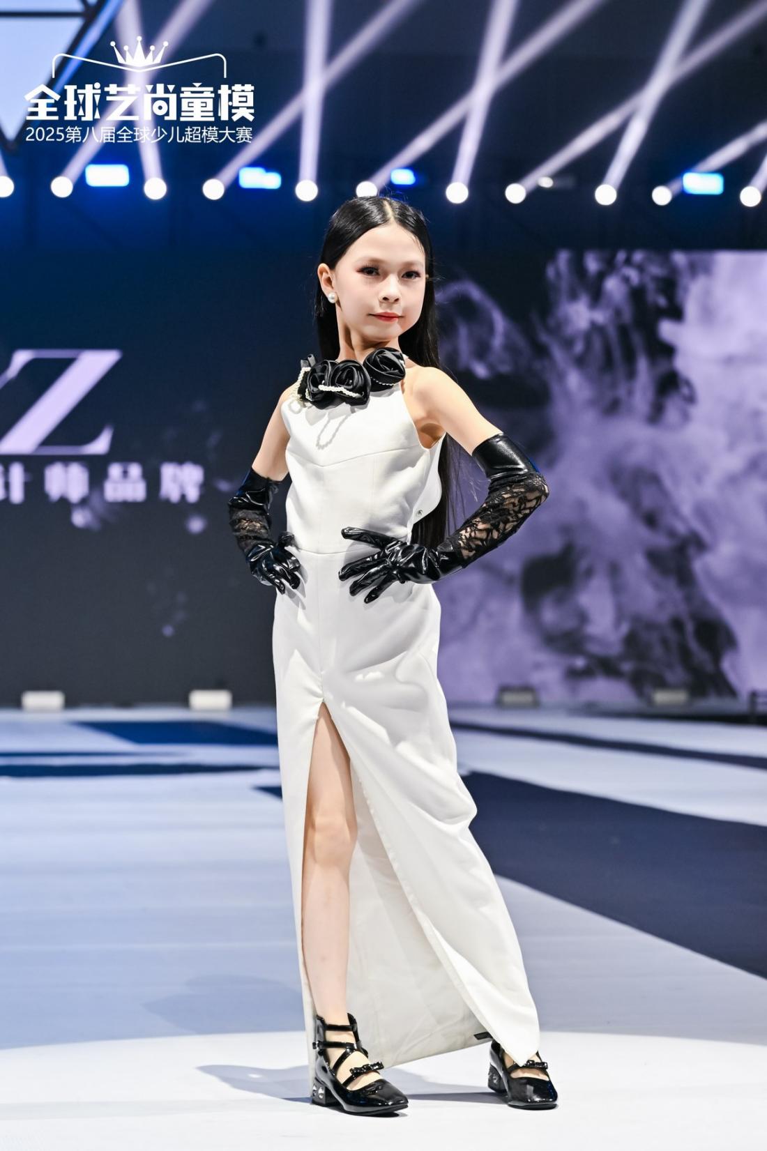 YZ品牌秀的登场,让优雅与个性融合的美学在王嘉慧的身上鲜活绽放!她的白色长裙虽以简约为整体风格,却在黑色装饰、开衩设计等细节处藏满巧思。王嘉慧踩着节拍穿梭秀道,既演绎出服饰对线条与质感的极致追求,又用童真赋予服装精致与灵动,让这身作品成为舞台上的焦点。