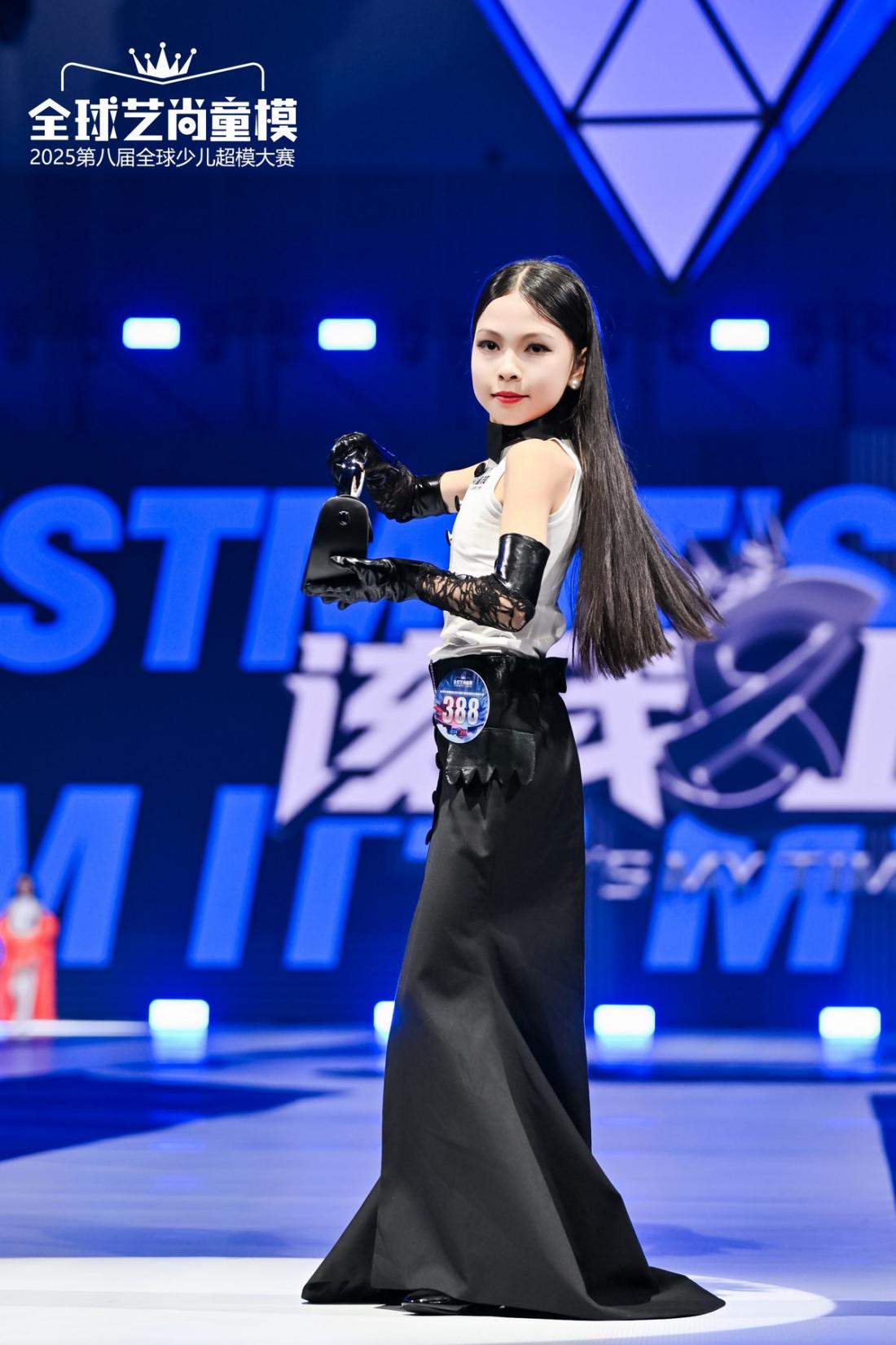 当“魔法压力破晓”的创意撞上自由DIY,第一套比赛服装便有了灵动模样!基础黑白配穿搭被赋予巧思,独特的剪裁与个性手套如同为潮流注入的奇妙灵感,既打破了常规搭配的平淡,又透着孩童特有的时尚感与灵动。王嘉慧穿着这套满是创意的服装登场,每一步都像在演绎 “潮酷舞台” 的活泼与张扬,瞬间让舞台充满个性与想象力。