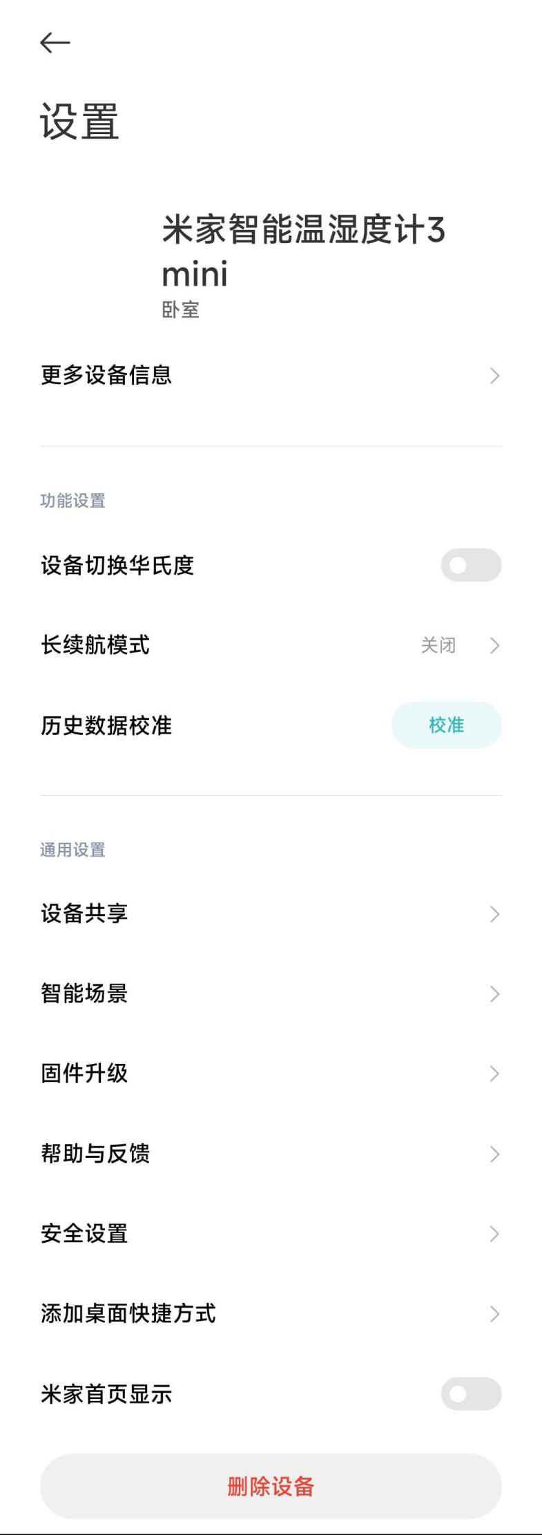 在产品的设置界面,除了常规的信息和设置,温湿度计3mini还可以切换长续航模式