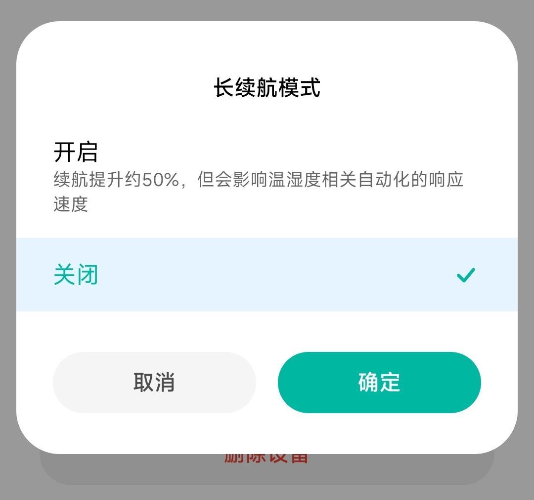 开启长续航模式后,续航大约提升50%(2年提升到3年),但会影响联动的响应速度。