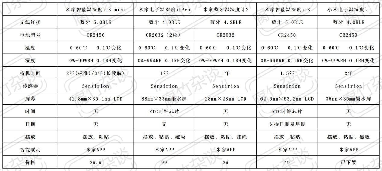 腐竹我也体验过多款温湿度计了,整理了一下多款米家的温湿度计,我们横向对比一下相关参数。