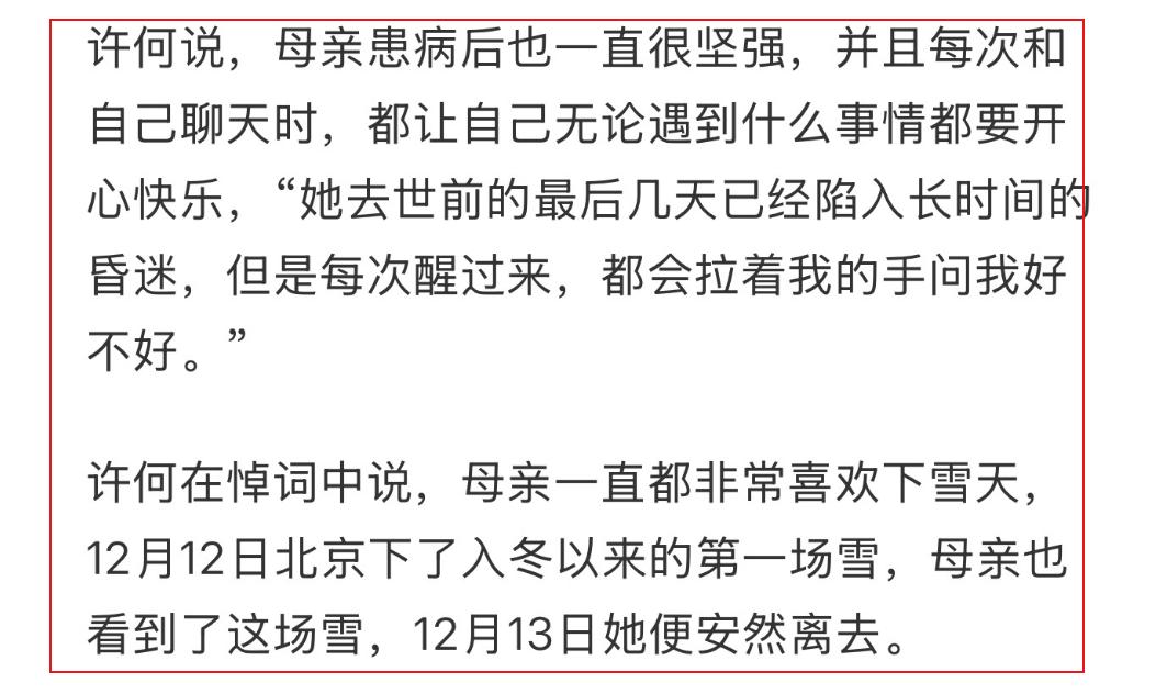 何晴离开了,她在这世上唯一的亲人只剩下24岁的儿子许何,当年她和许亚军离婚,2岁的儿子被判给了男方,但是许亚军在采访中曾经提到过,儿子十八岁以后就让他出去租房子,或许和家庭经历有关系,许何非常独立,操持母亲的葬礼,已经像是个大人了。
