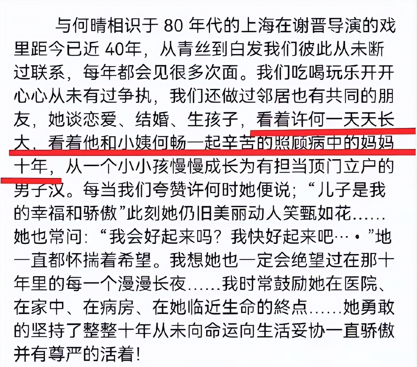 如今何晴离世快半个月了,她生前的闺蜜透露,原来她生命的最后时光都是儿子陪伴着度过,许亚军在采访中所说的租房子或许只是为何晴保留体面而已,许何是和母亲一起住的。