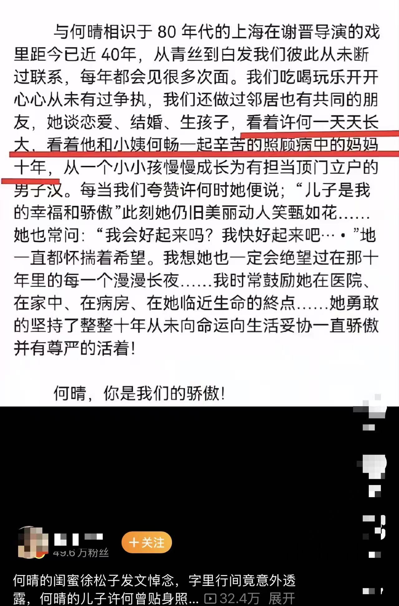 闺蜜透露许何知道母亲生病后,从一个小小孩蜕变成顶天立地的男子汉,大家只要是夸赞许何,何晴就忍不住说儿子是她的骄傲,足以可见她对于儿子也是满心满眼的疼爱。