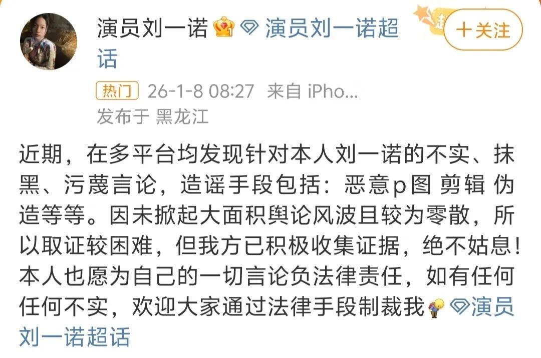 直至1月8号上午,刘一诺再次发博,表示愿为自己的一切言论负法律责任。