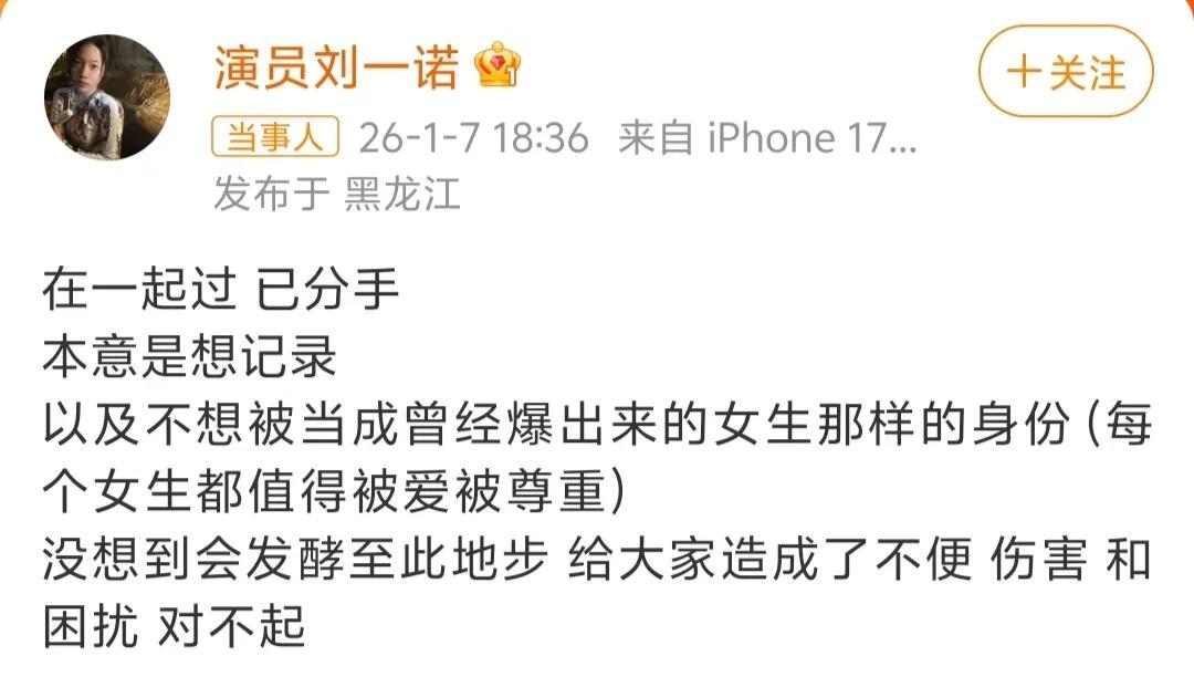 檀健次发声不久后,作为当事人的刘一诺也发布了声明:在一起过,已分手。