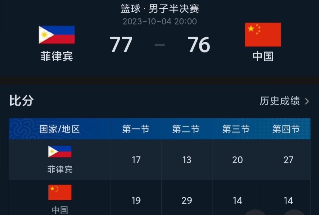 二、2023年主场杭州亚运会:周琦作为主力中锋的中国男篮,在半决赛中爆出大冷,内线遭到完爆,以76-77遭到菲律宾二队绝杀,菲律宾队主要得分手,来自NBA的克拉克森、麦凯恩和杰伦-格林,均因各种问题未能参赛。