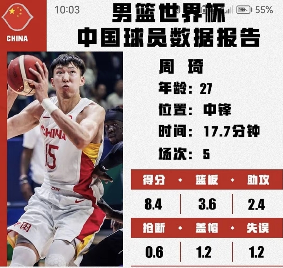 看一下,周琦的个人数据,场均8.4分、3.6个篮板,具体如下: