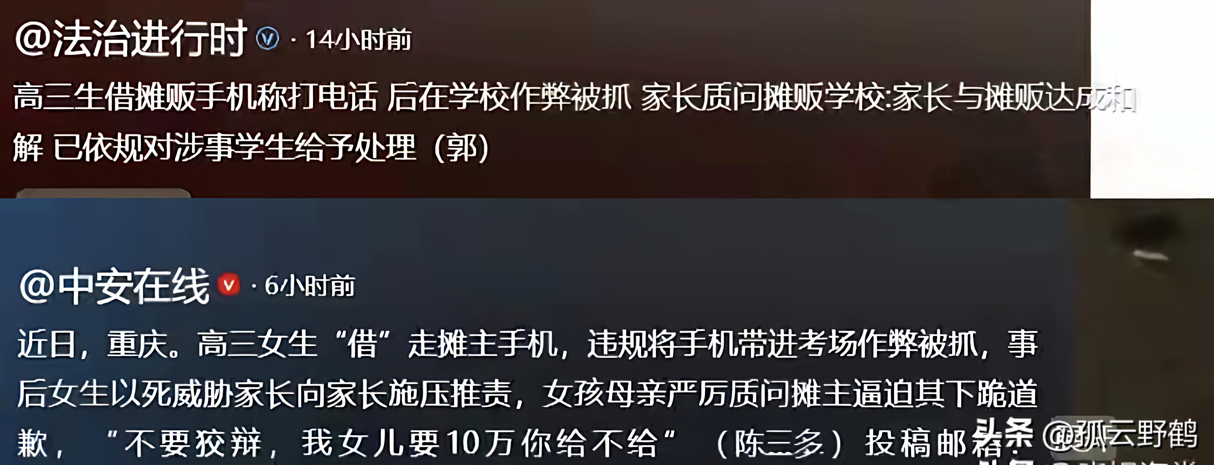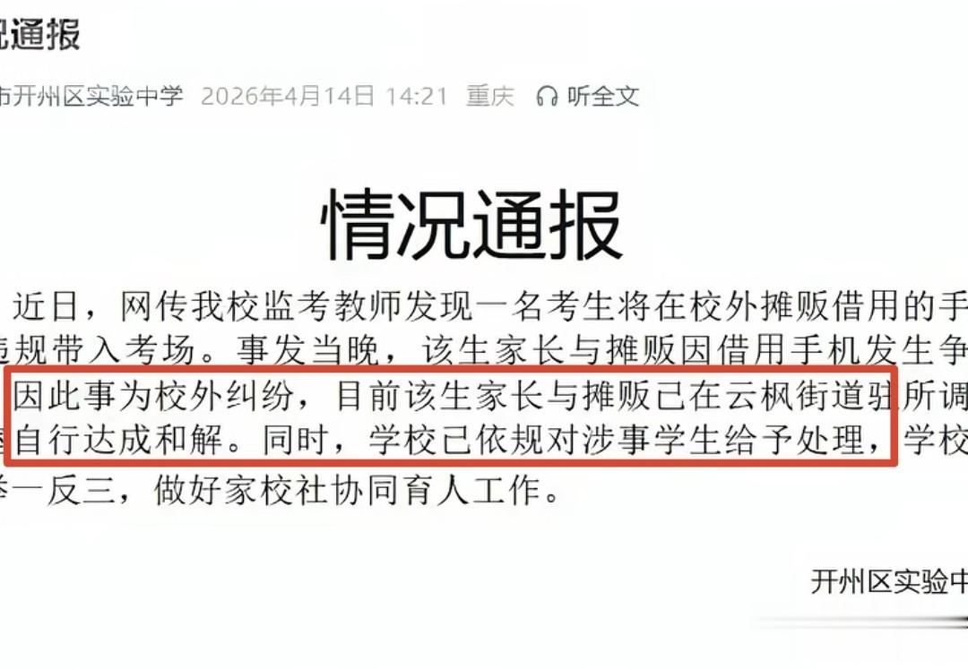 近日,重庆开州那场因“借手机作弊”引发的风波,终于有了结果。4月14日,实验中学发布通报:确认高三女生违规携带摊主手机进考场作弊,已依规处理,校外家长与摊主的纠纷,经调解已达成和解。随着嚣张家长的真容被曝光,以及摊主被迫下跪的细节传开,网友的愤怒仍未平息,这场和解,真的能抹平所有伤害吗?