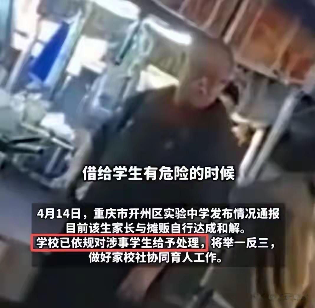 随着舆论发酵。重庆市开州区实验中学与4月14日发布情况通报称: “目前该生家长与摊贩自行达成和解。学校已依规对涉事学生给予处理,将举一反三,