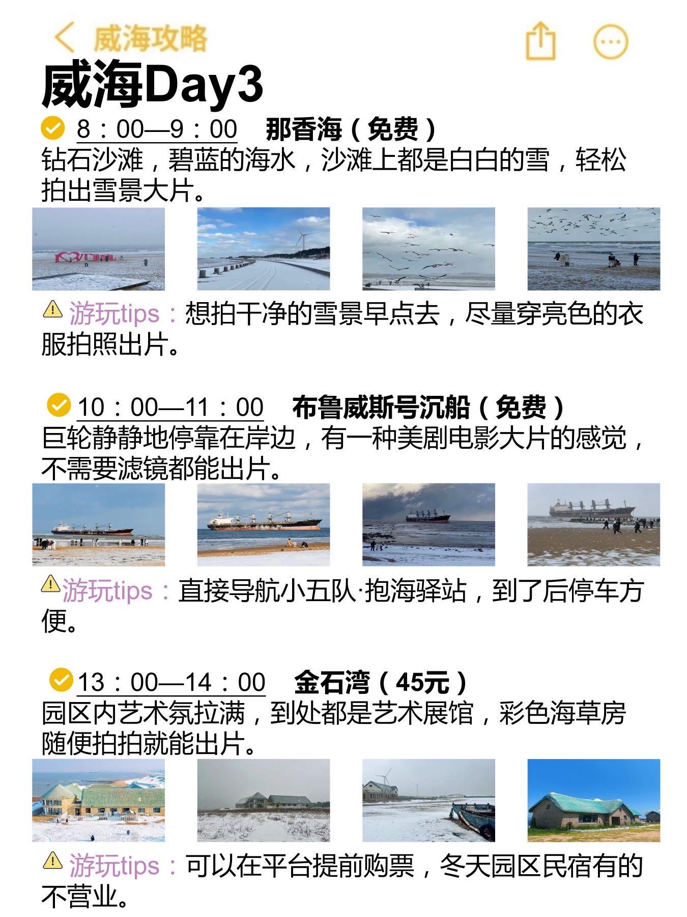 🗺️第三天早上出发到了那香海,钻石💎沙滩覆盖着白雪,像走进冰雪🧊世界~接着去了布鲁威斯号沉船,巨轮静静地靠在岸边,像电影里的末日场景~随便拍🃏都是大片,然后去了金石湾,彩色海草房像童话小屋🎡,接着就回市区的威海公园,打卡了‘大相框’雕塑,最后逛了新威附路🚏,这条街全是文艺小店,买了好多冰箱贴,晚上去吃了🍖杏梨烤肉,五花肉绝了,薄厚刚好,烤得滋滋冒油~