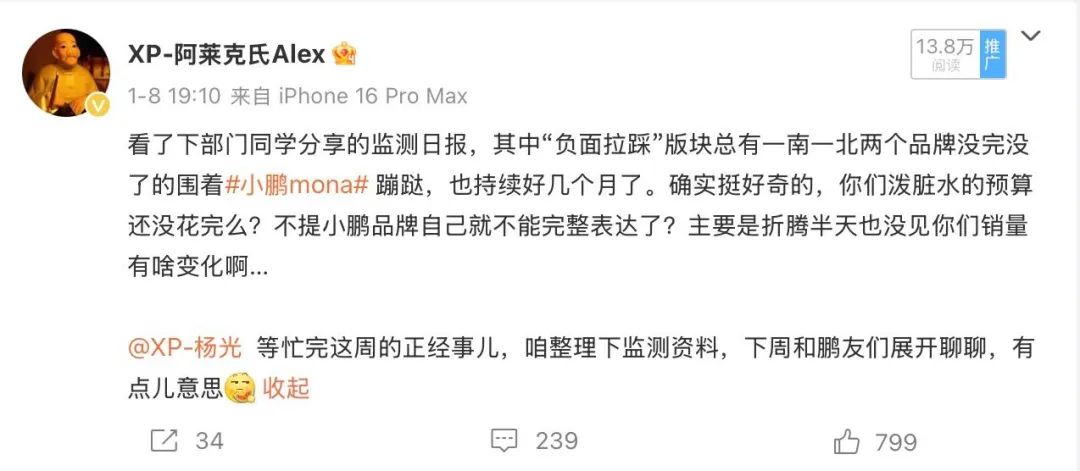 就连浓眉大眼的一些G字头车企也在干这种事,小鹏公关王晨前几天微博说一南一北两家车企围绕mona长期发黑帖,多达七千多条,但是又没有办法反击,只能匿名喊话,随后攻击停止。