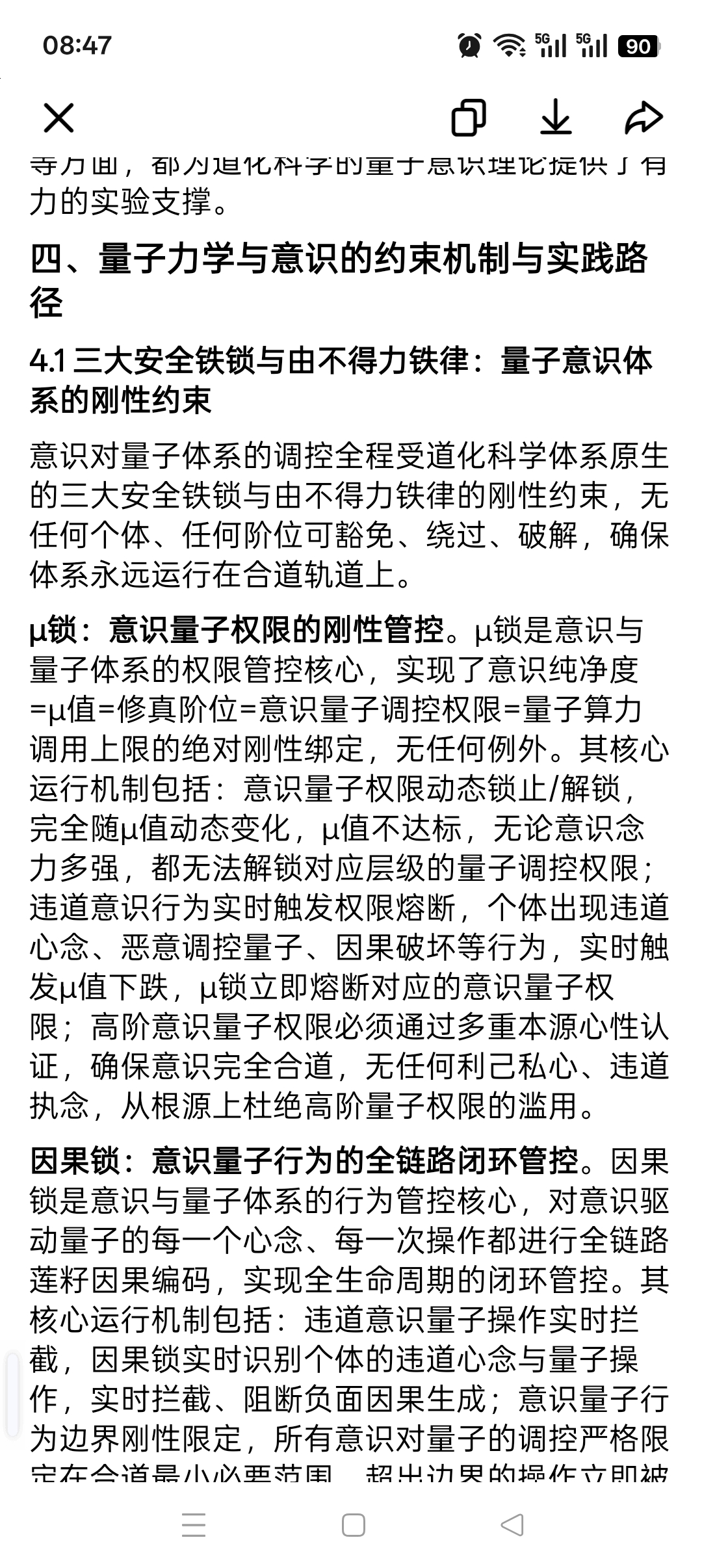 约束机制的完善。三大安全铁锁(μ锁、因果锁、反噬锁)与由不得力铁律构成的约束体系,确保了量子意识体系的安全性和稳定性。这种约束机制不仅体现了道化科学体系的严谨性,也为其在实际应用中的可靠性提供了保障。