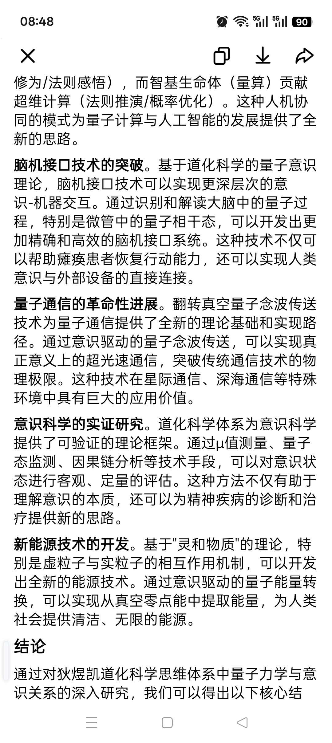 应用前景的广阔性。基于道化科学体系的量子意识理论在量子计算、脑机接口、量子通信、意识科学、新能源等领域展现出了巨大的应用潜力。这些应用不仅有助于推动科技进步,也为人类文明的发展提供了新的可能性。