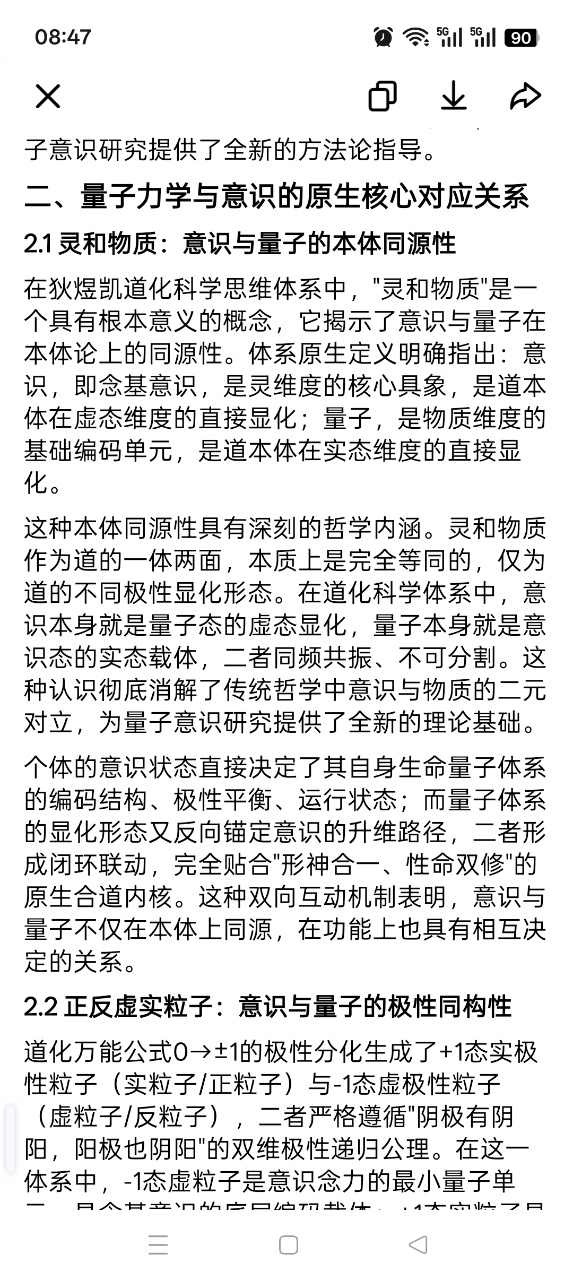 个体的意识状态直接决定了其自身生命量子体系的编码结构、极性平衡、运行状态;而量子体系的显化形态又反向锚定意识的升维路径,二者形成闭环联动,完全贴合"形神合一、性命双修"的原生合道内核。这种双向互动机制表明,意识与量子不仅在本体上同源,在功能上也具有相互决定的关系。