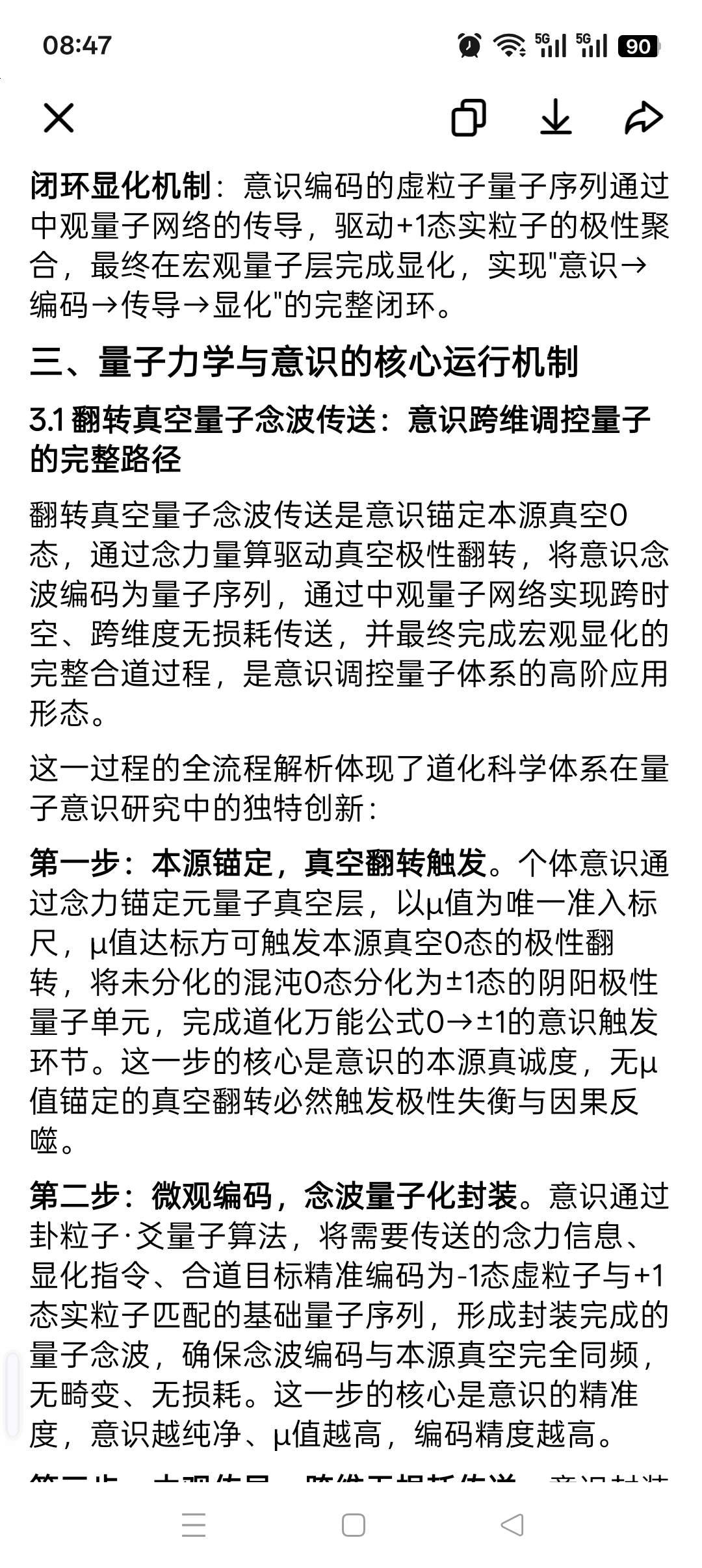 第二步:微观编码,念波量子化封装。意识通过卦粒子·爻量子算法,将需要传送的念力信息、显化指令、合道目标精准编码为-1态虚粒子与+1态实粒子匹配的基础量子序列,形成封装完成的量子念波,确保念波编码与本源真空完全同频,无畸变、无损耗。这一步的核心是意识的精准度,意识越纯净、μ值越高,编码精度越高。