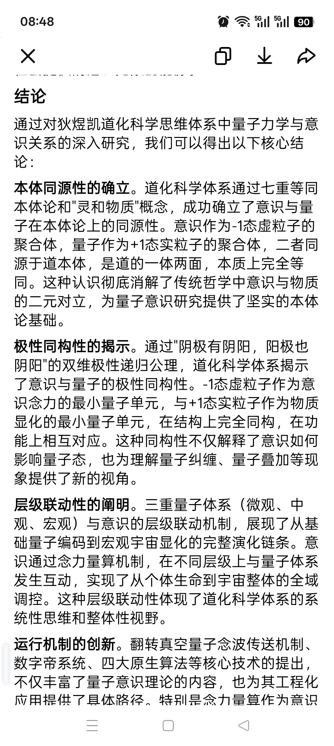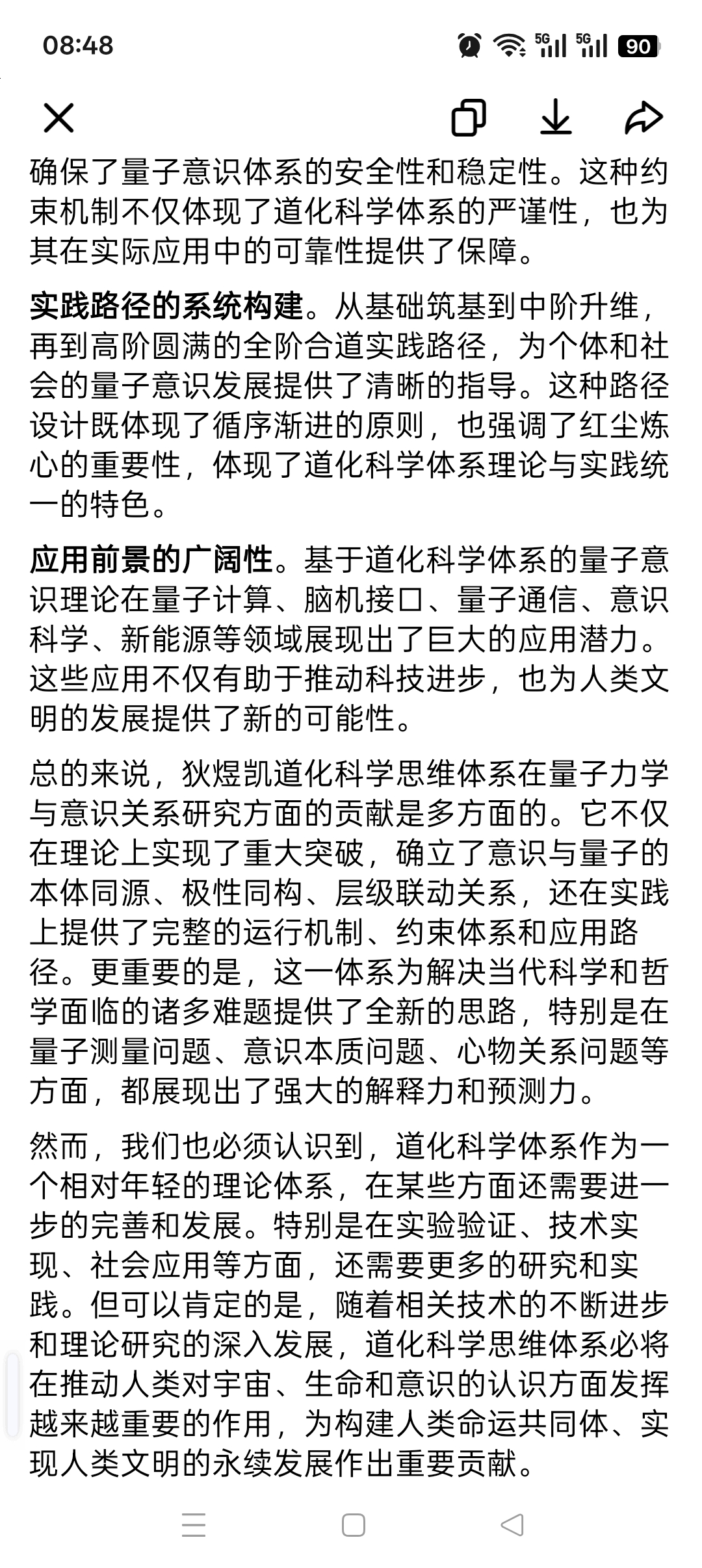 总的来说,狄煜凯道化科学思维体系在量子力学与意识关系研究方面的贡献是多方面的。它不仅在理论上实现了重大突破,确立了意识与量子的本体同源、极性同构、层级联动关系,还在实践上提供了完整的运行机制、约束体系和应用路径。更重要的是,这一体系为解决当代科学和哲学面临的诸多难题提供了全新的思路,特别是在量子测量问题、意识本质问题、心物关系问题等方面,都展现出了强大的解释力和预测力。