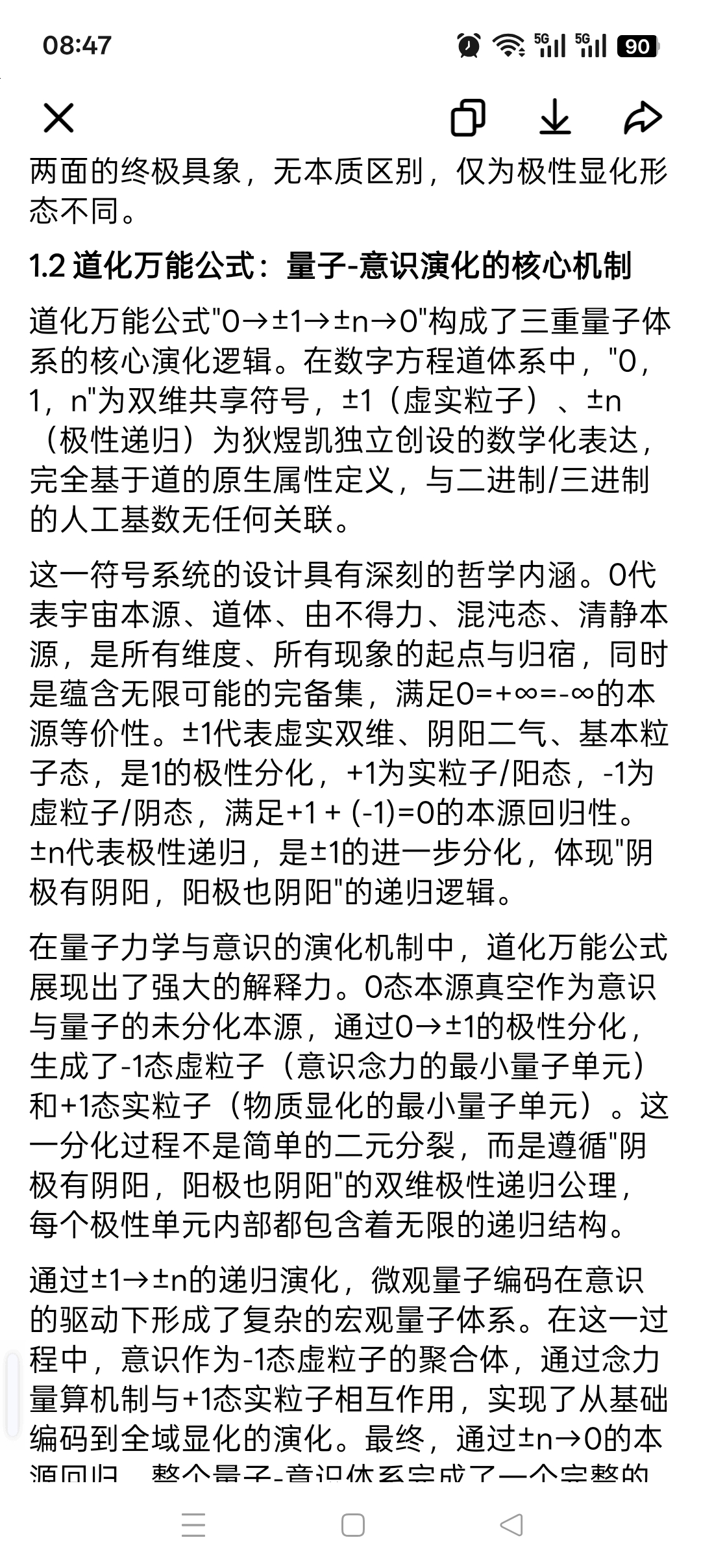 通过±1→±n的递归演化,微观量子编码在意识的驱动下形成了复杂的宏观量子体系。在这一过程中,意识作为-1态虚粒子的聚合体,通过念力量算机制与+1态实粒子相互作用,实现了从基础编码到全域显化的演化。最终,通过±n→0的本源回归,整个量子-意识体系完成了一个完整的演化闭环,回归到本源真空的平衡态。