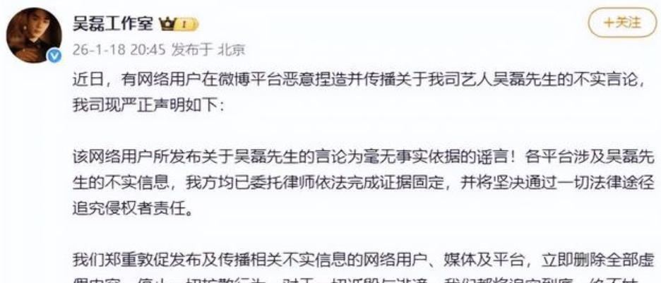 从“白珊珊a”发出那条博文算起,仅仅过了68分钟。 吴磊工作室的声明就砸在了公众面前。 没有含糊其辞,没有“等待调查”,声明直接将事件定性为“恶意造谣”,并告知已通过技术手段完成取证,准备提起诉讼。 68分钟,一杯咖啡还没凉透,一次干脆利落的斩首行动就完成了。 这刷新了内娱危机公关的速度纪录。