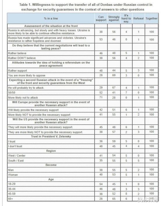 数据还显示,54%的乌克兰人认为,以安全保障换取将整个顿巴斯地区移交给els控制是绝对不可接受的。