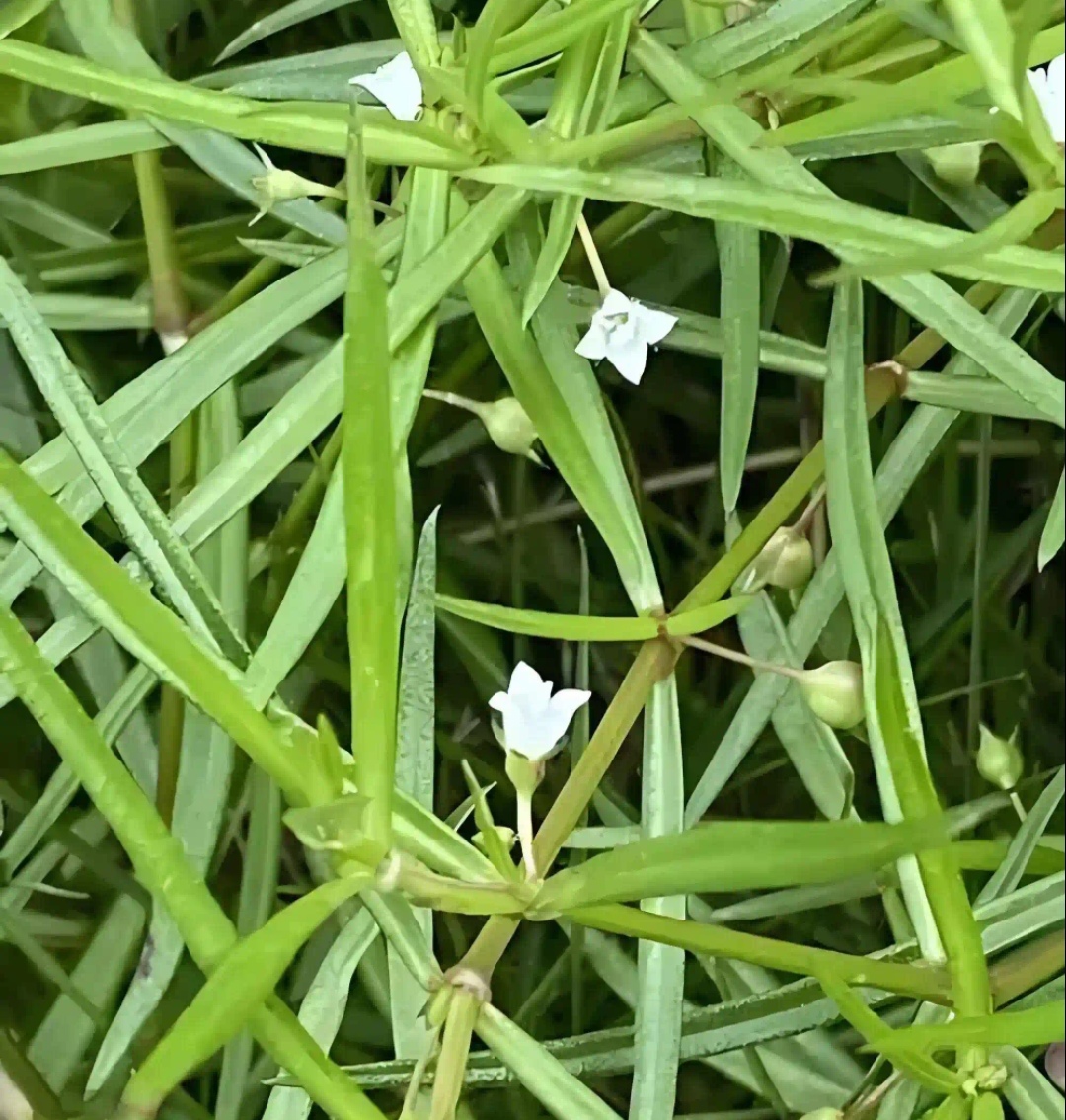 白花蛇舌草是茜草科一年生草本植物,茎纤细得如同发丝,高度在15 - 50厘米之间,从基部就分出好多枝杈。它的叶子形状特别,像蛇的舌头,没有叶柄,细细长长的,顶端短尖,边缘干后还常常背卷,中脉凹下去像条小沟。每年7 - 9月,白色筒状小花单生或者双生于叶腋,就像一个个微型喇叭。到了果期,会结出扁球形的蒴果,成熟时顶部开裂,像四个小碗聚在一起。