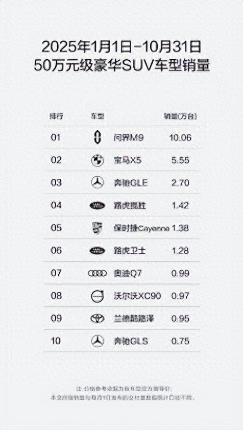 在当前的汽车市场中,一个引人瞩目的现象正在上演:尽管5米级豪华SUV细分市场已有约20款自主品牌车型激烈角逐,问界M9却以卓越的市场表现持续领跑。最新销量数据显示,2025年1月1日至10月31日,问界M9累计销量达10.06万台,稳居50万元级豪华SUV销量榜首。更值得关注的是,上市至今全系累计交付已突破26万辆,持续保持50万元以上价格区间的市场领先地位。